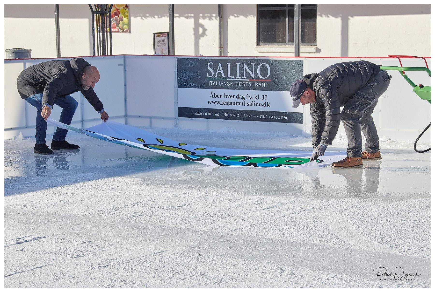 Her er det Per Kalstrup og Peter Dahl fra bestyrelsen, der er i gang med at nedlægge reklamer i isen. Forinden er der opsat reklamer på banderne. Reklamerne er med til at sikre økonomien til banens drift.